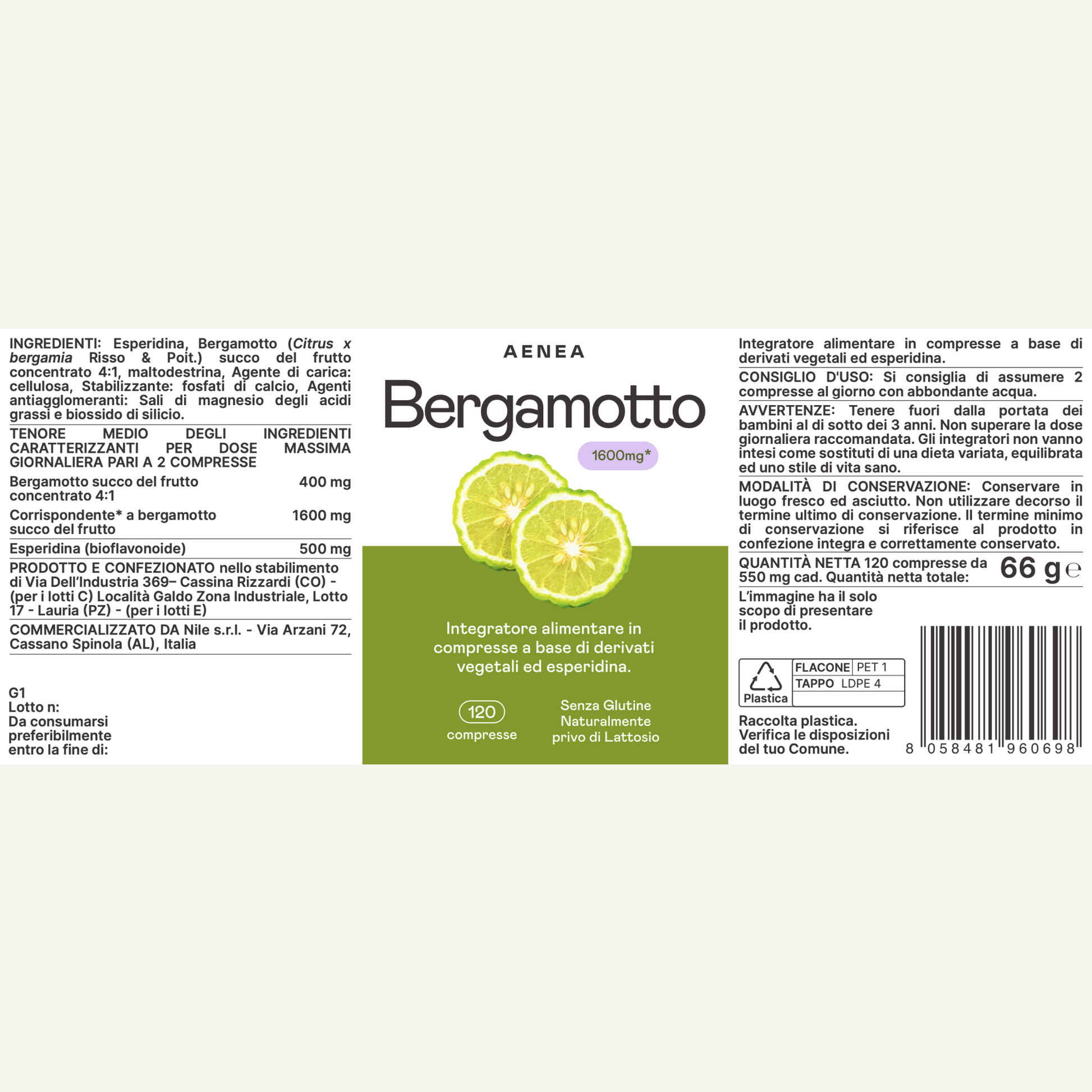 Ingredienti per 2 compresse: Bergamotto succo del frutto concentrato 4:1 400mg (corrispondente a bergamotto succo del frutto estratto 1600mg) , Esperidina (bioflavonoide) 500mg