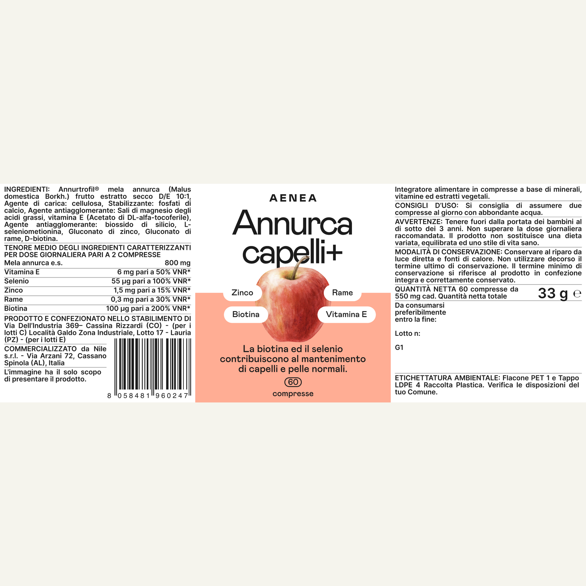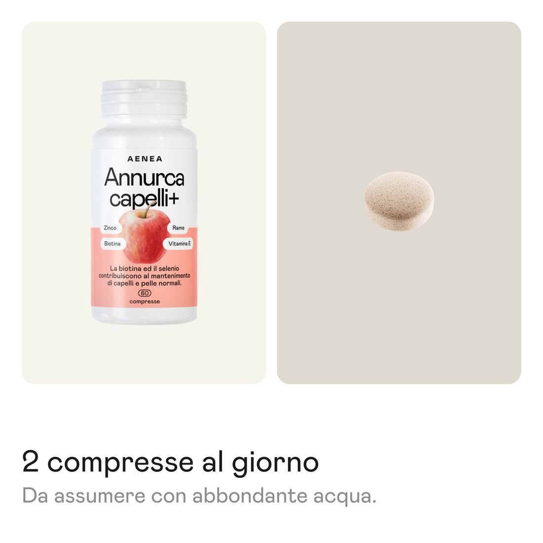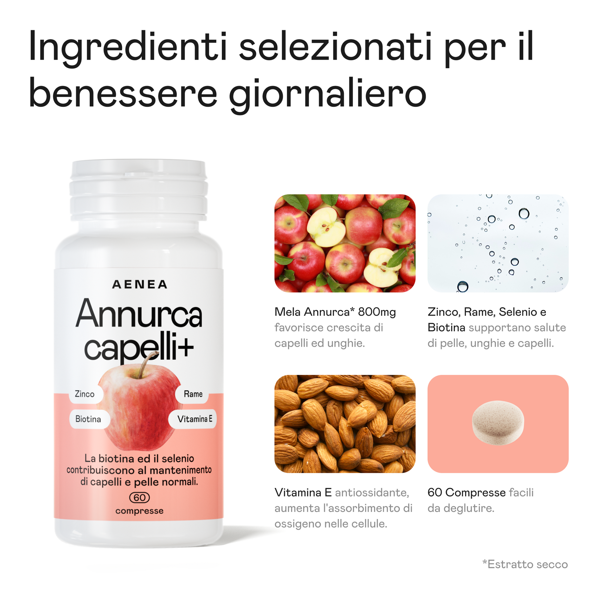 Integratore Annurca Capelli+: contiene estratto di Mela Annurca, Biotina, Rame, Zinco, Selenio e Vitamina E — assumere 2 capsule al giorno con acqua