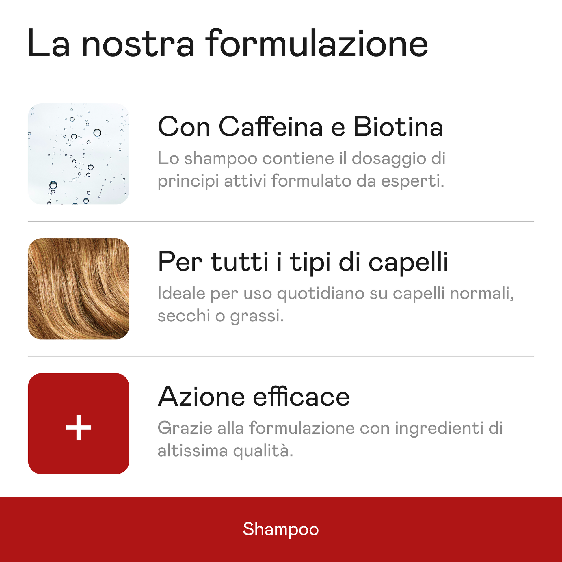 Shampoo Anticaduta: contiene Biotina, Caffeina ed Estratto di Rosmarino — applicare sui capelli bagnati, massaggia per 2 minuti, lascia agire un paio di minuti e risciacqua.