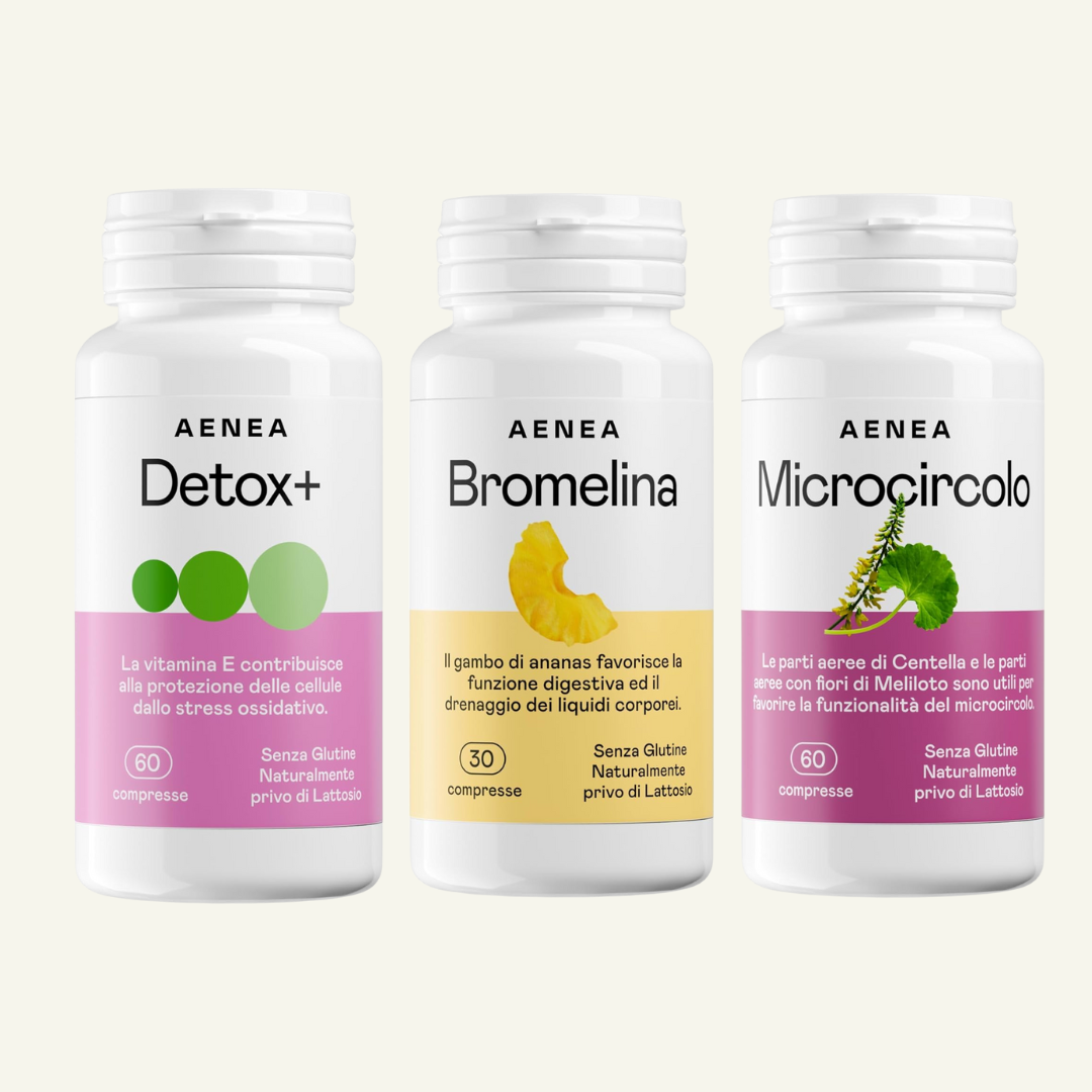 - Contenuto: Detox+ (60 compresse), Bromelina (30 compresse), Microcircolo (60 compresse)