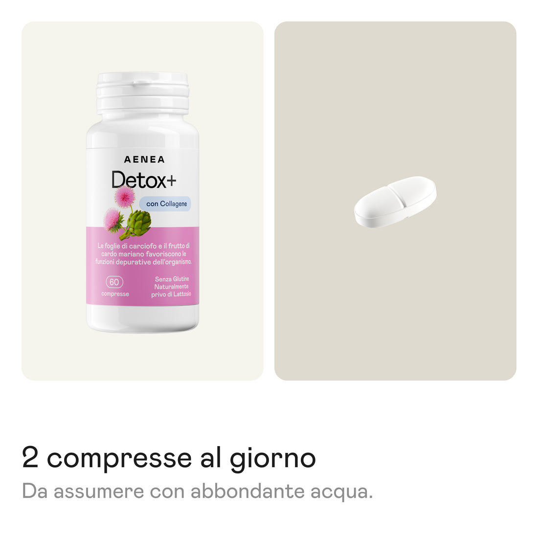 Ingredienti per 2 compresse di Detox+: Collagene idrolizzato 250mg, Broccolo 80mg di cui sulforafano 0,4mg, Acido Jaluronico 50mg, Acido Alfa lipoico 50mg, Resveratrolo 20mg, Vitamina E 12mg