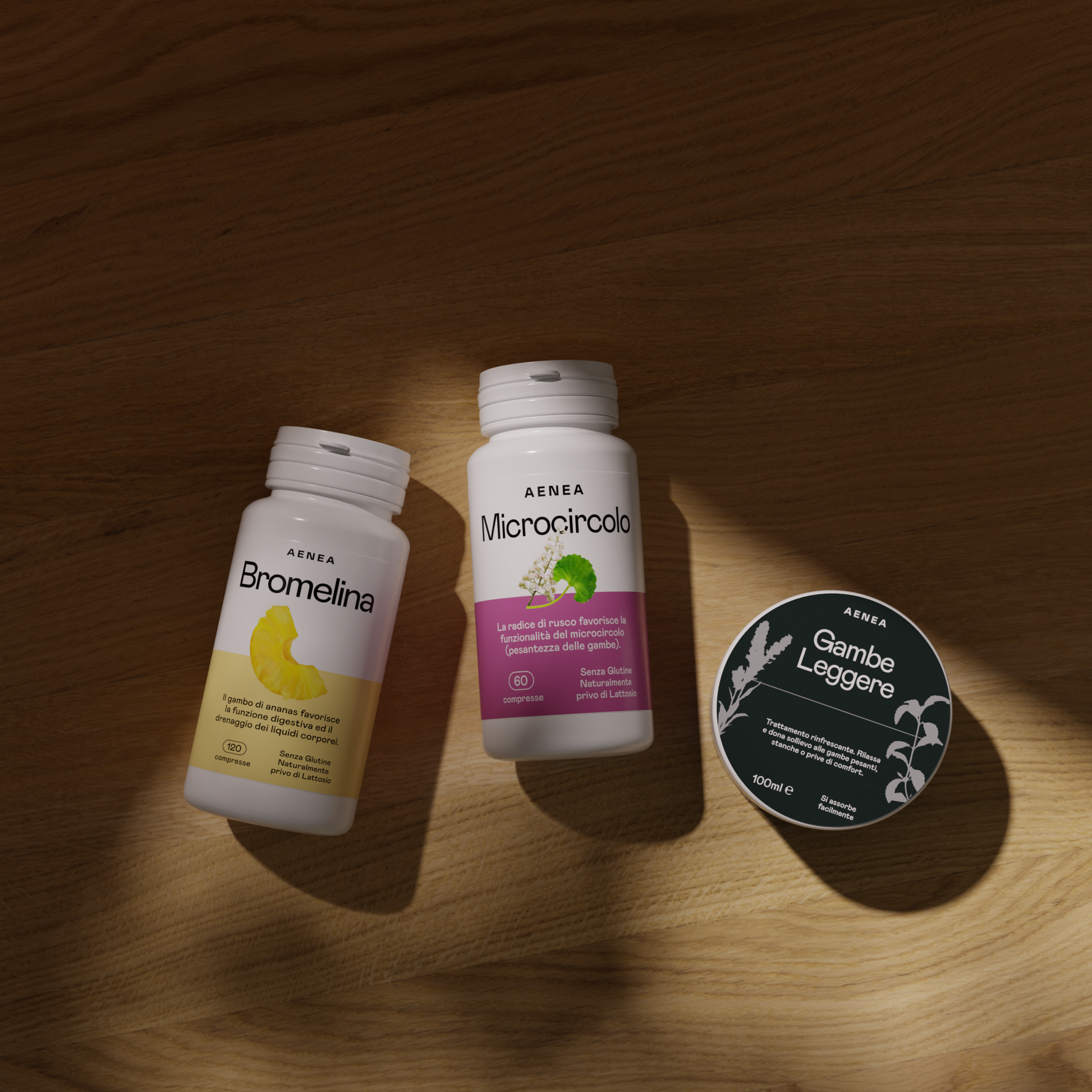 - Contenuto: Bromelina (30 compresse), Microcircolo (60 compresse), Crema Gambe Leggere (100ml)