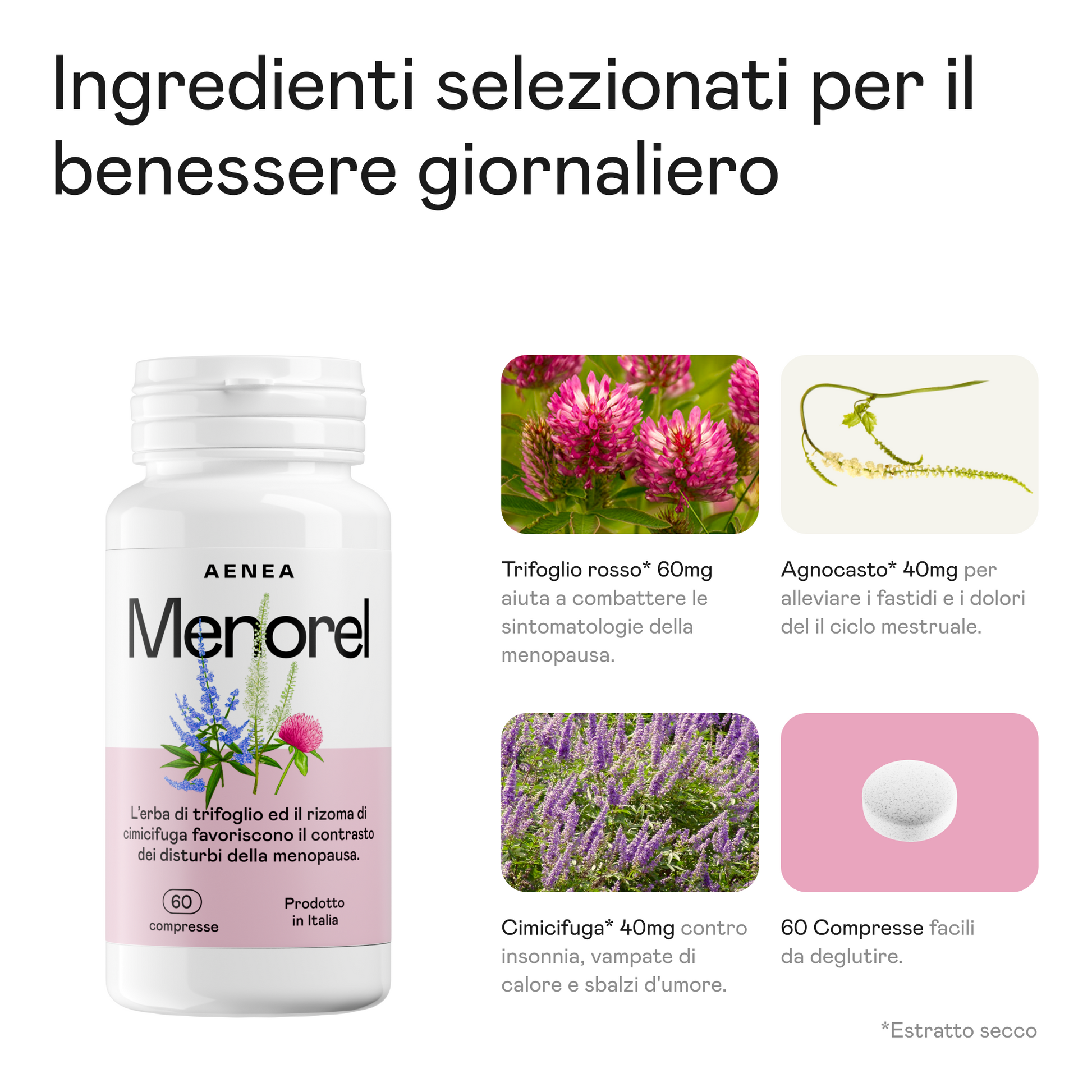 Ingredienti per 1 compressa di Menorel: Agnocasto 40mg, Cimicifuga 20mg di cui glicosidi triterpenici (saponine) 0,5mg, Trifoglio rosso 60mg di cui isoflavoni totali 4,8mg
