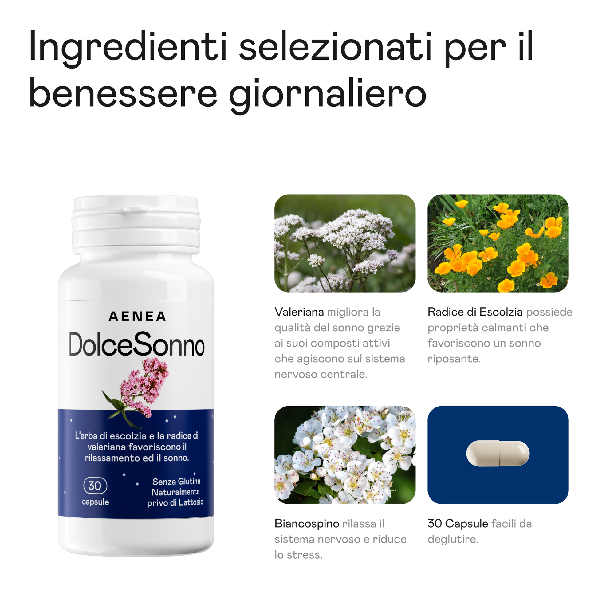 Ingredienti per 1 compressa di Dolcesonno: Valeriana 100mg, Escolzia 100mg, Biancospino 50mg, Triptofano 50mg