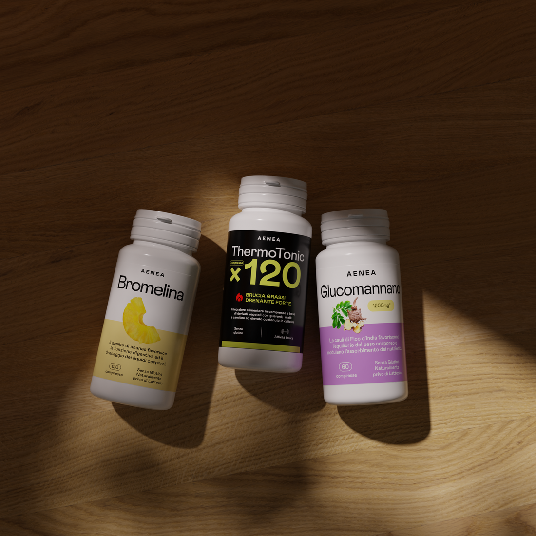 - Contenuto: 2 unità di Bromelina (60 compresse tot.), ThermoTonic (120 compresse), 2 unità di Glucomannano (120 compresse tot.)