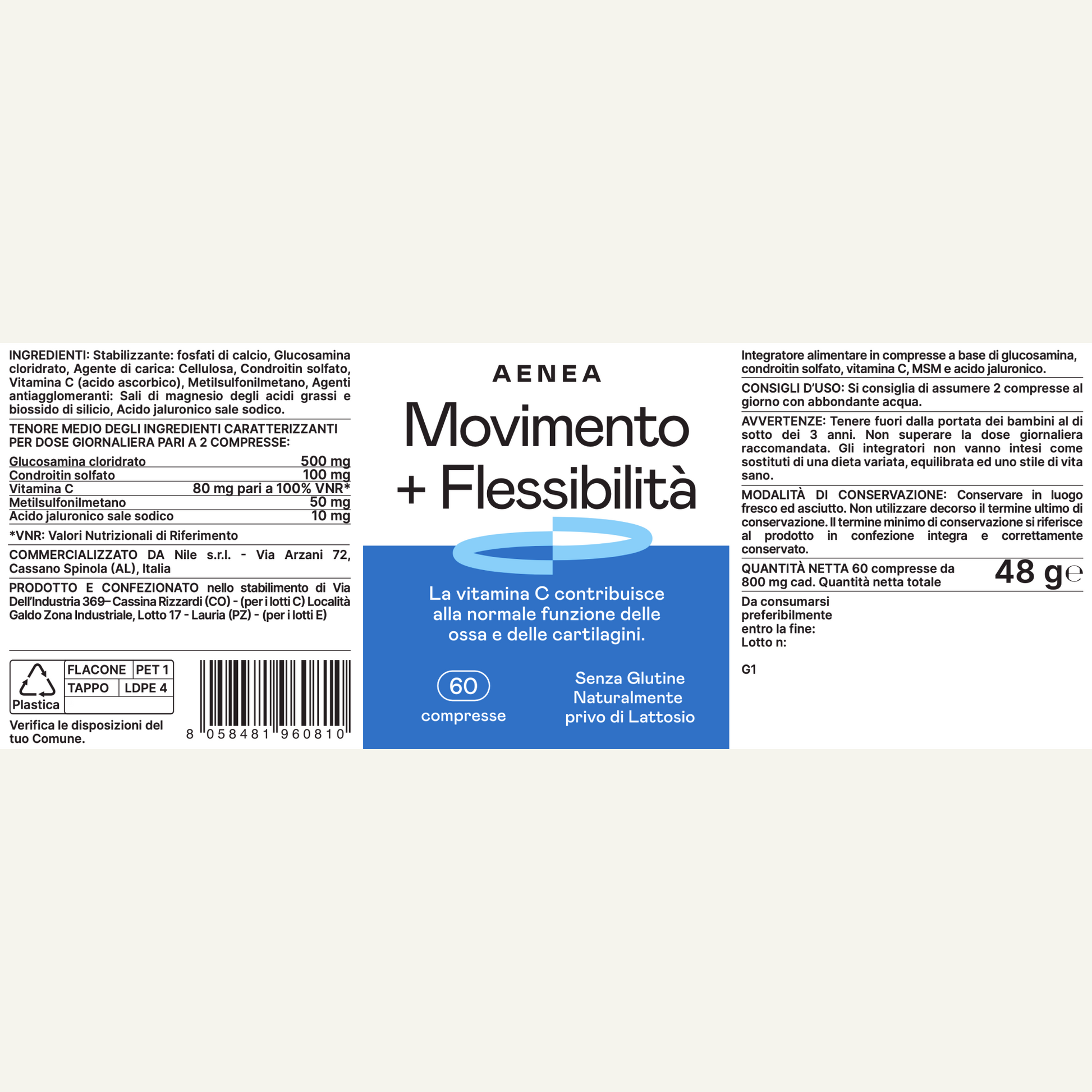 - Ingredienti: Glucosamina, Condroitina solfato, Vitamina C, Acido Ialuronico
